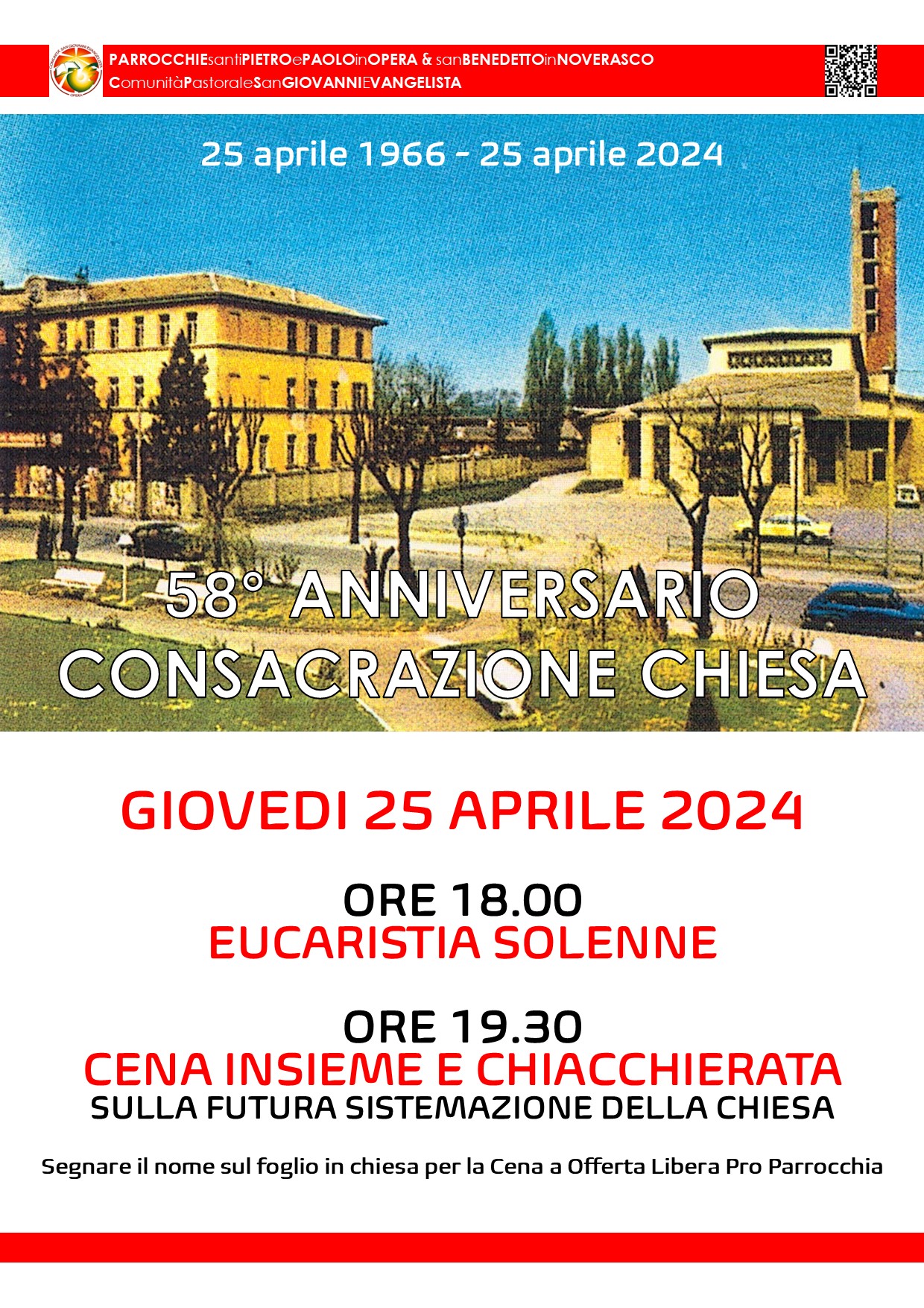 58° Consacrazione Chiesa Pubblicato giorno 20 aprile 2024 - In home page Importante appuntamento per tutta la Comunità Pastorale. Non Mancare