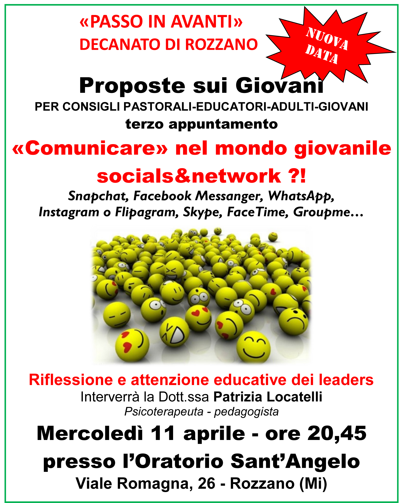 Passo in avanti, decanato di Rozzano, incontro da non perdere il prossimo 11 aprile 2018, presso l’Oratorio Sant’Angelo a Rozzano. H 20,45. Siete tutti invitati.