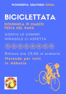 Carissimi tutti, grandi e piccini, l’oratorio Santi Pietro e Paolo organizza per Domenica 19 Marzo, Festa del Papà una bellissima biciclettata insieme. Si parte dall’Oratorio alle ore 15 per arrivare all’Abbazia Mirasole dove giocheremo e faremo una buona merenda in compagnia. Vi aspettiamo numerosi!!!!!