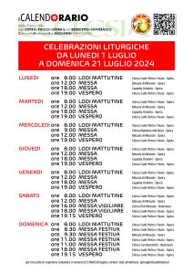 Orario Celebrazioni 1 – 21 luglio 2024 Pubblicato giorno 11 luglio 2024 - In home page Orario Estivo 2024 messe